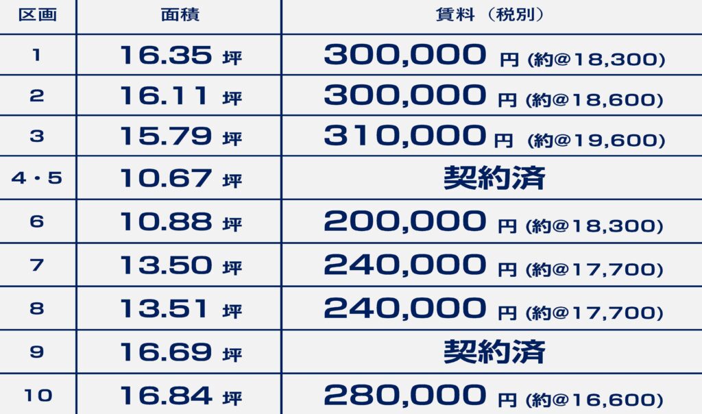 ・賃料:区画によって異なります。下記写真をご覧ください✨